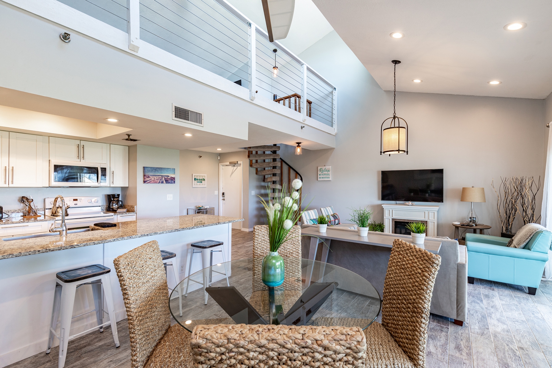 Electric fireplace, spiral staircase, 4 flat-screen Smart TVs